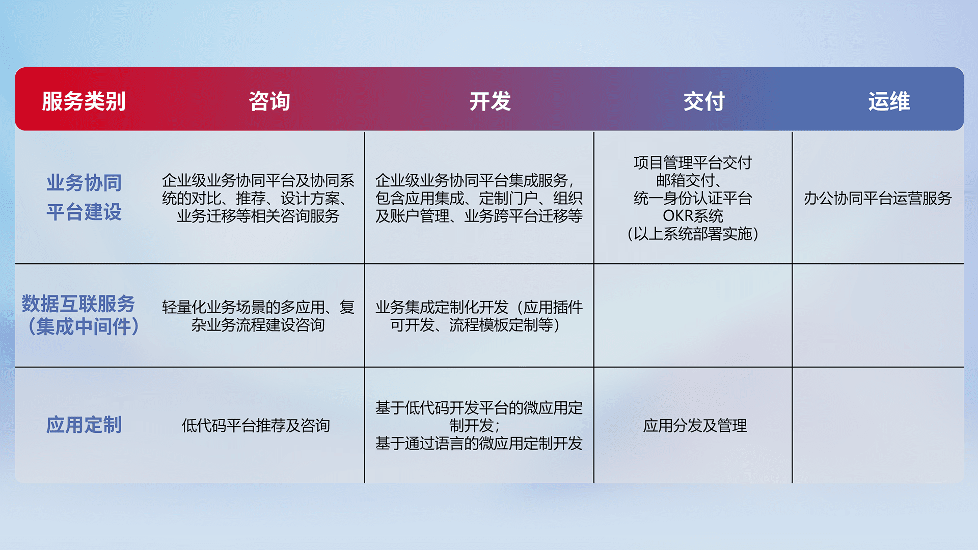 针对钉钉、、企微、、IDaas等平台级产品提供产品的规划、、、、方案、、交付、、、、定制化开发等服务,,,,实现如统一协同办公、、、、智能客户服务、、、混合会议管理、、、智能数据查询、、等业务场景,,,实现数字化转型。。。。